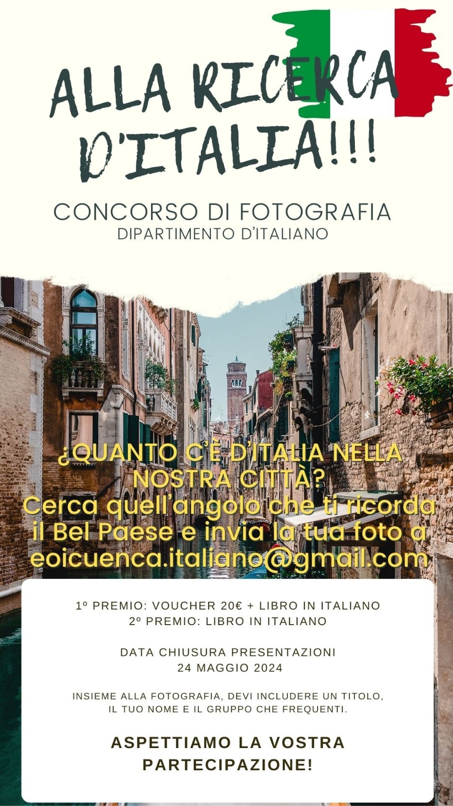 El 24 de mayo finaliza la admisión de fotografías para el concurso organizado por el departamento de Italiano. El lema es " Quanto c'è 'Italia nella nostra città" Habrá un primer premio consistente en un vale de 20 € canjeables por material escolar en la Librería Lorca. El segundo premio consistirá en un libro en italiano. ¡Animaos a participar! Enviad una fotografía al correo del departamento eoicuenca.italiano@gmail.com