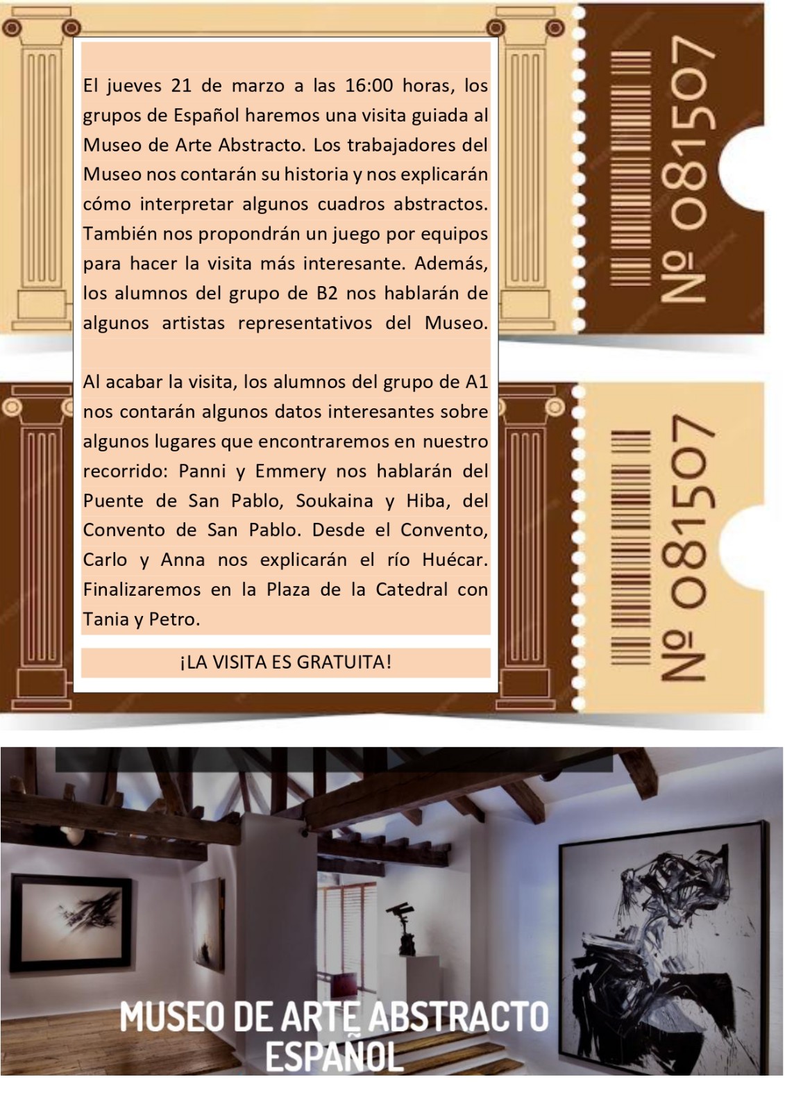 El jueves 21 de marzo a las 16:00 horas, los grupos de Español haremos una visita guiada al Museo de Arte Abstracto de Cuenca. Los trabajadores del Museo nos contarán su historia y nos explicarán cómo interpretar algunos cuadros abstractos. También nos propondrán un juego por equipos para hacer la visita más interesante. Además, los alumnos del grupo de B2 nos hablarán de algunos artistas representativos del Museo. Al acabar la visita, los alumnos del grupo de A1 nos contarán algunos datos interesantes sobre algunos lugares que encontraremos en nuestro recorrido.