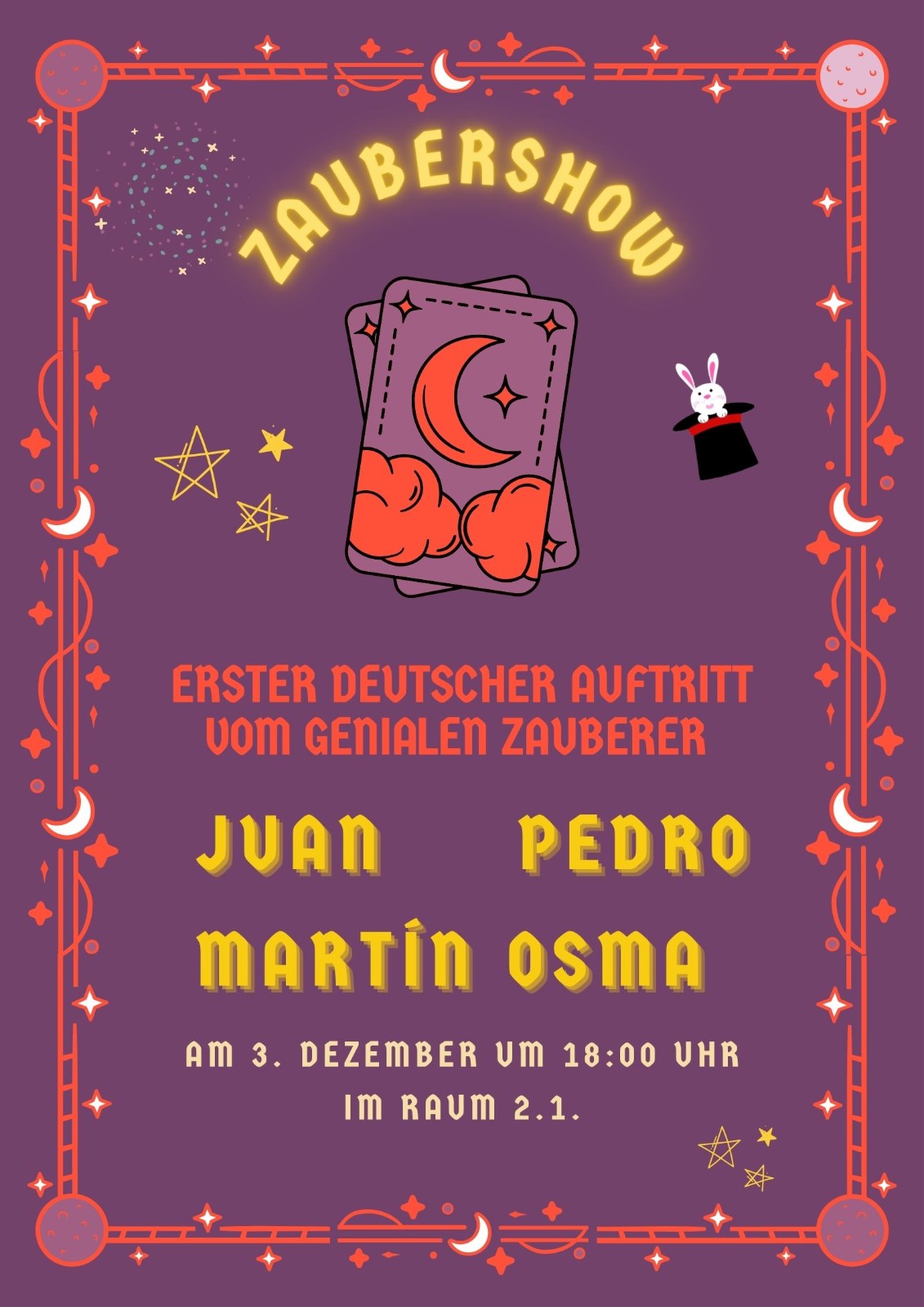 El 3 de diciembre a las 18:00 horas el alumno de Alemán Juan Pedro Martín Osma realizará un espectáculo de magia en el aula 2.1. ¡¡No te puedes perder su primera actuación en alemán!!